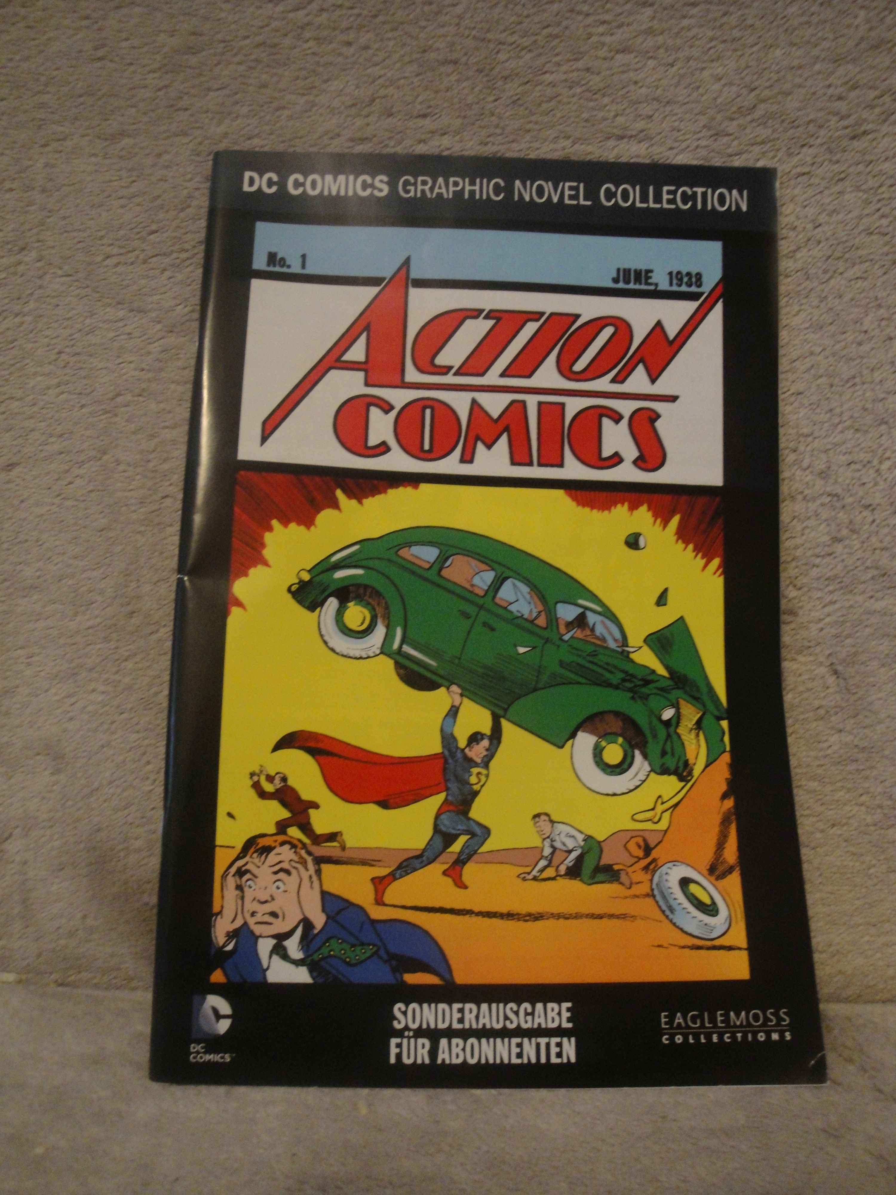 Das Faksimile von Action Comics #1 (GRATIS mit der 1. Lieferung), das Lesezeichen (GRATIS mit der 2. Lieferung), das erste Blechschild (GRATIS mit der 3. Lieferung), das zweite Blechschild (GRATIS mit der 4. Lieferung) und die Buchstützen (GRATIS mit der 6. Lieferung).