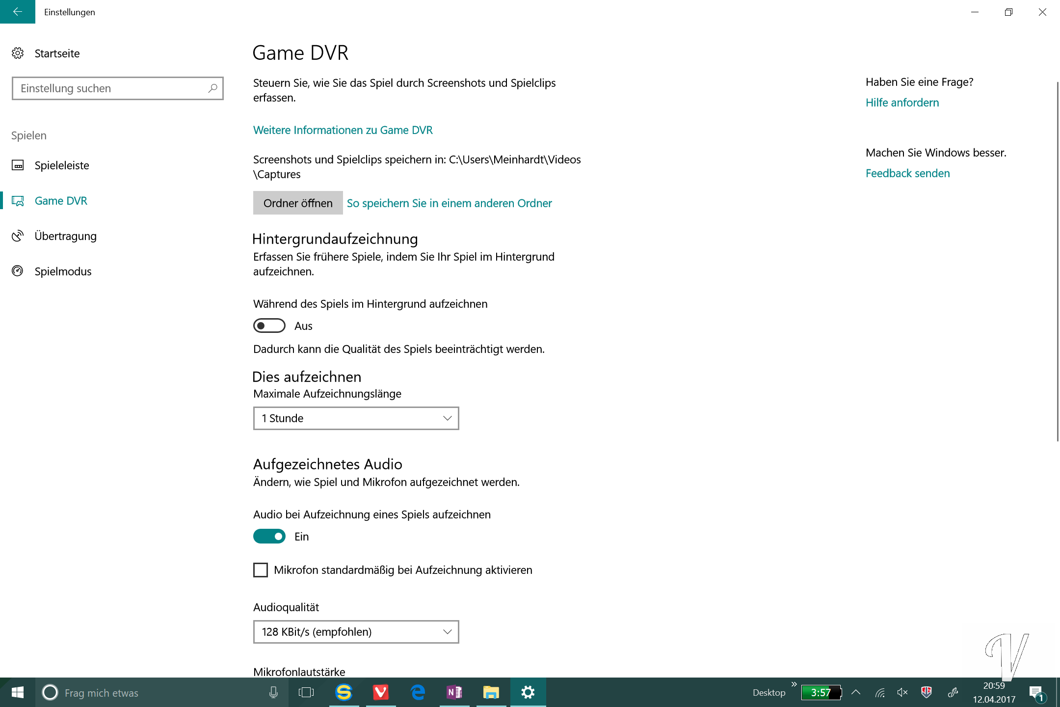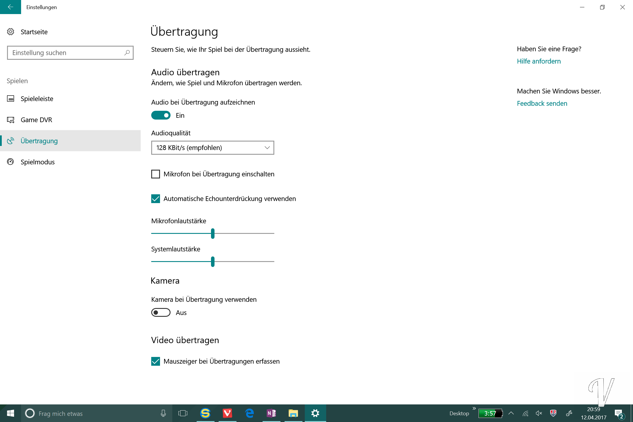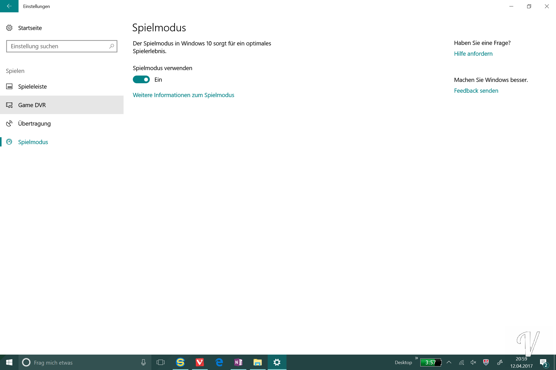 Omnipräsent ist eine neue Option, die man direkt in den Windows-Einstellungen findet. Dieser Punkt hört auf den Namen Spielen. Hier gibt es diverse Einstellungen wie Spieleleiste, Game DVR, Übertragung und den Spielmodus. Aktiviert man diesen werden Spieleprozesse hoch priorisiert und die anderen Prozesse herabgestuft. Man kann auch während des Spielens einen Stream aufmachen oder chatten.